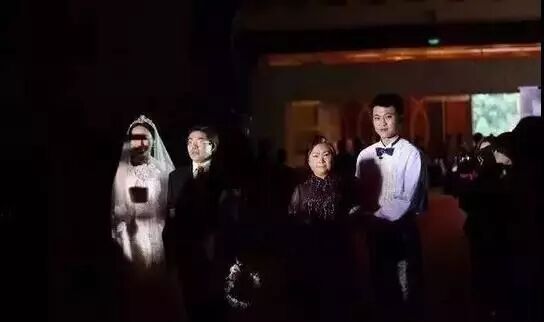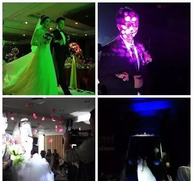 当全场灯光变暗的时候,追光灯对准新人,并且在新人周围2-3米的范围内形成一个亮的区域,目的就是突出新人。如果只使用一台的追光灯,就会形成所谓的“阴阳脸”,影响视觉效果。建议有条件的话一定要用两台,让两侧的光线对称。追光灯最好能够悬挂起来 ,避免被遮挡,这样才能发挥最佳效果。